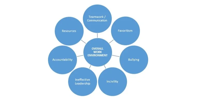 Then, analyze the concerns and categorize them by magnitude and severity. Then, distill the information into themes which outline the primary sources of discomfort in the workplace. A visual, such as the following, can be helpful to preview the themes before discussing each in detail: